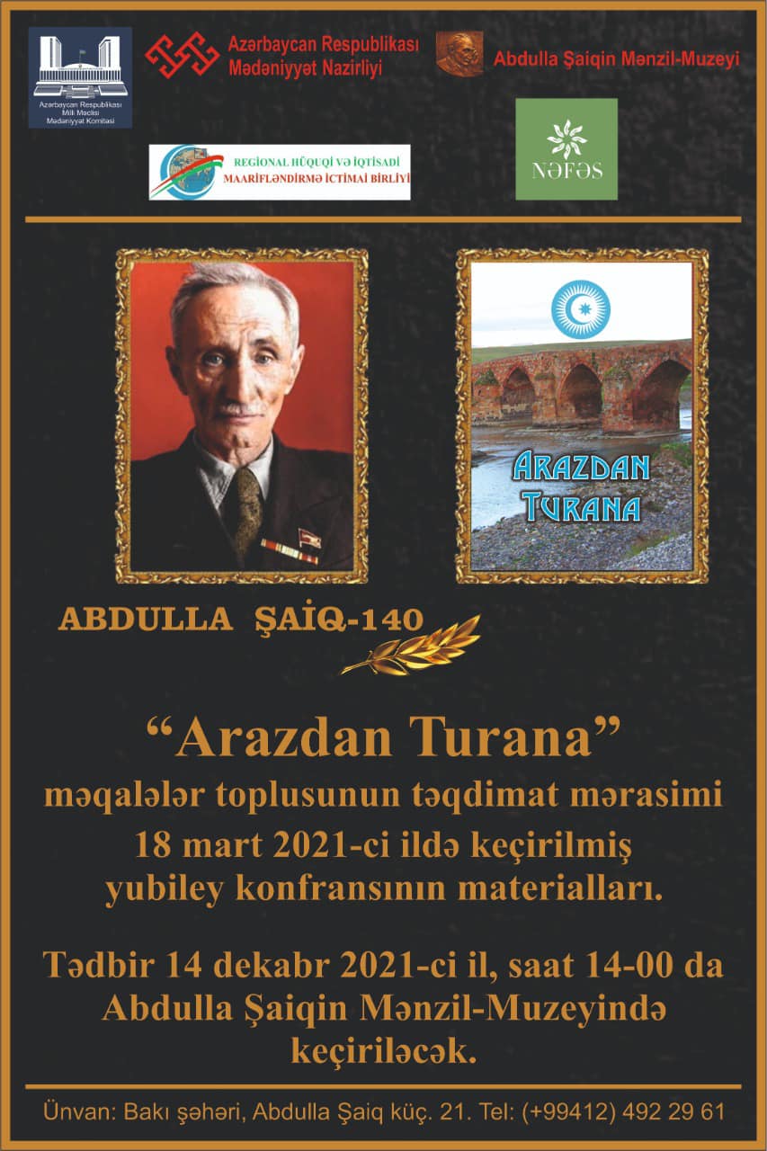 Azərbaycanın görkəmli uşaq şairi Abdulla Şaiqin 140 illik yubileyinə həsr edilmiş “Arazdan Turana” virtual konfransın materiallarından ibarət məqalələr toplusunun təqdimat mərasimi keçirilib. Tədbir Abdulla Şaiqin Mənzil-Muzeyində təşkil olunub.
