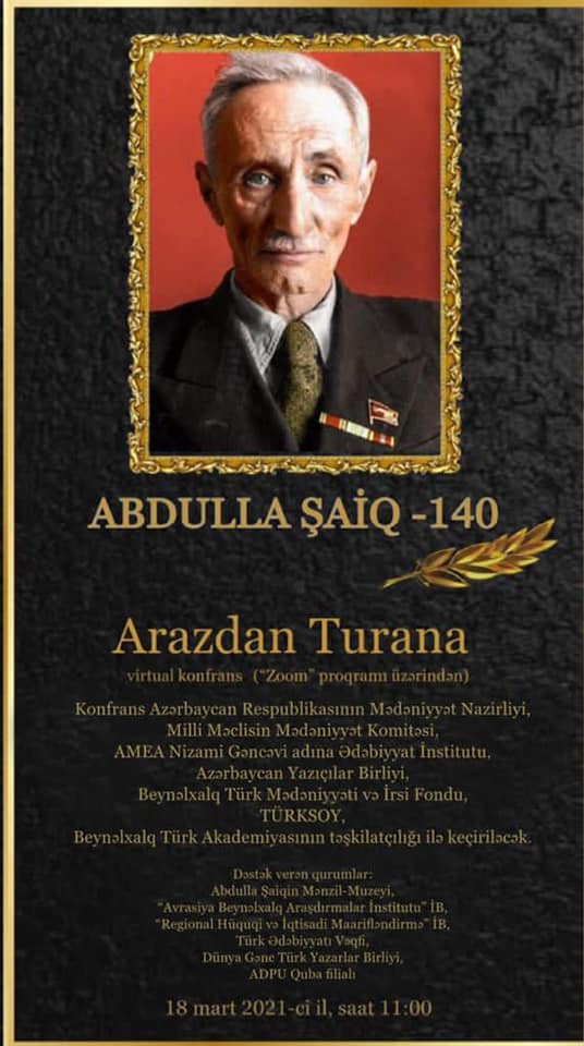 Beynəlxalq Türk Mədəniyyəti və İrsi Fondunun prezidenti Günay Əfəndiyeva Azərbaycanın görkəmli şairi Abdulla Şaiqin 140 illiyinə həsr olunmuş “Arazdan Turana” adlı onlayn konfransda iştirak edib.