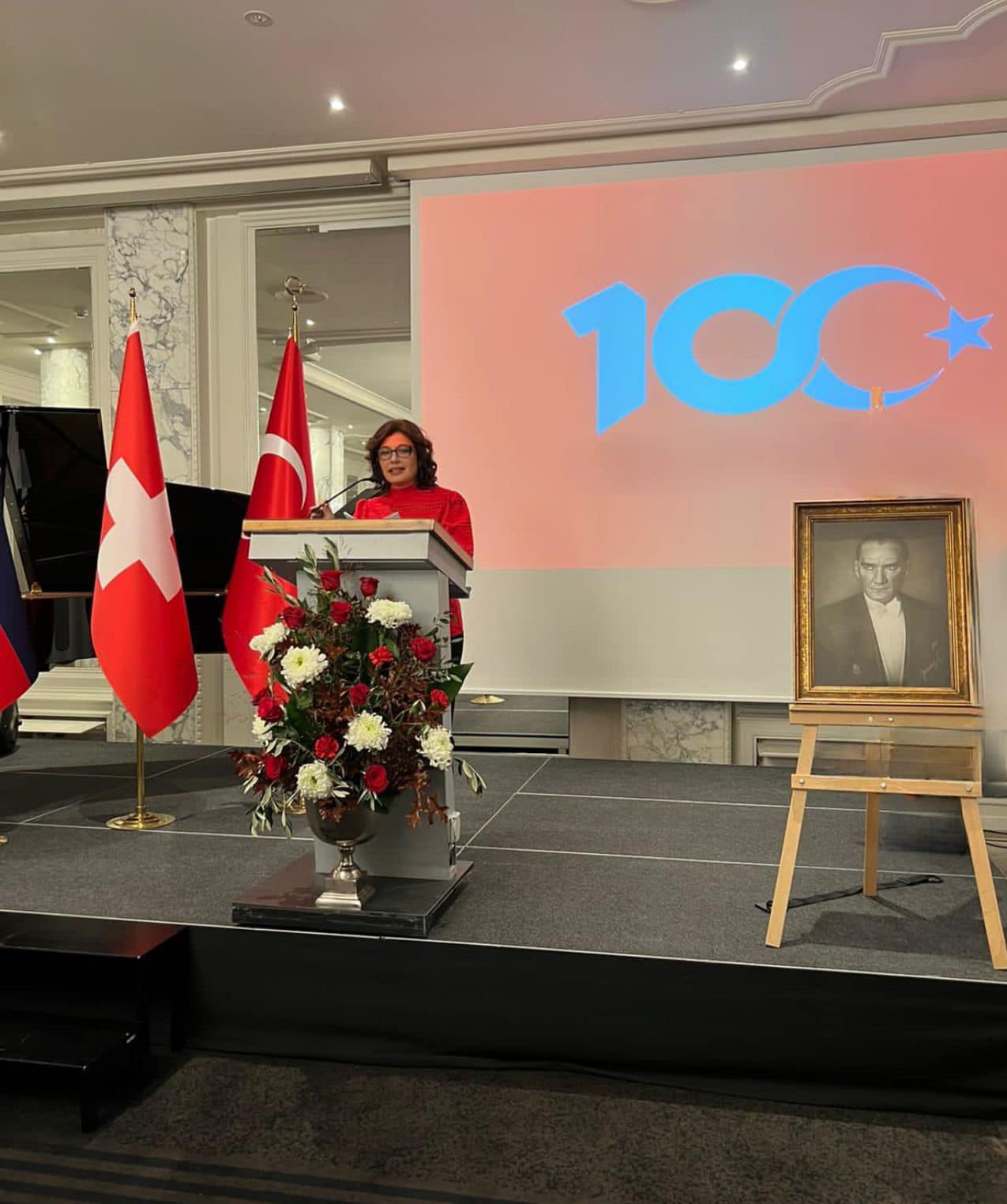 Tədbiri açıq elan edən Türkiyə Respublikasının İsveçrə Konfederasiyasındakı fövqəladə və səlahiyyətli səfiri Emine Ece Özbayoğlu Acarsoy, Qazi Mustafa Kamal Atatürkün “ən böyük əsərim” adlandırdığı Cümhuriyyətin, Türkiyənin demokratikləşməsinin, inkişafının və müasirləşməsinin təminatı olduğuna diqqət çəkərək, ölkənin nüfuzunun günü-gündən artmasının qürurverici olduğunu vurğulayıb. Öz çıxışında o, həmçinin, qəhrəman Azərbaycan ordusunun həyata keçirdiyi uğurlu antiterror tədbirləri nəticəsində Prezident İlham Əliyev tərəfindən üçrəngli Azərbaycan bayrağının Xankəndində ucaldılmasının bütün Türk dünyasını duyğulandırdığını, bununla da regionda daimi sülh və sabitliyin əldə olunması yolunda mühüm maneənin aradan qaldırıldığını qeyd edib.