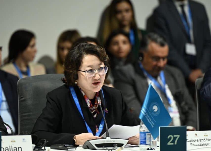 Aktotı Raimkulova çıxışında iqlim dəyişikliyinin müxtəlif sahələrə, o cümlədən mədəniyyətə də təsir göstərdiyini vurğulayıb: "Qlobal istiləşmə, daşqınlar, dağıntılar, təbii fəlakətlər, zəlzələlər şəraitində mədəniyyət obyektləri məhvolma təhlükəsi ilə üz-üzə qalır. Belə hallar baş verərkən biz hər zaman maddi və mədəni irsə aid nadir abidələri bərpa etmək işində daim səfərbər olmalıyıq. Tarixi obyektlərin dəqiq, uzunmüddətli, elektron nüsxələrinin yaradılması məqsədilə Türk Mədəniyyəti və İrsi Fondu Azərbaycan, Qazaxıstan, Qırğızıstan, Macarıstan və bir çox digər ölkələrdə maddi-mədəni irsin, əlyazma abidələrin, saray komplekslərinin rəqəmsallaşdırılması istiqamətində fəal addımlar atır.